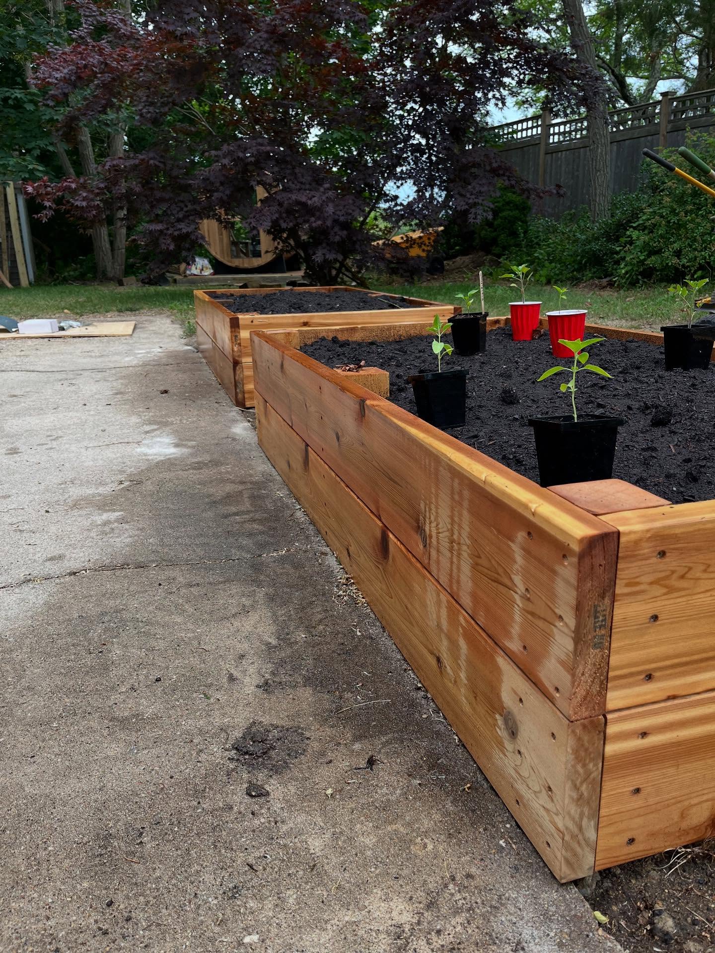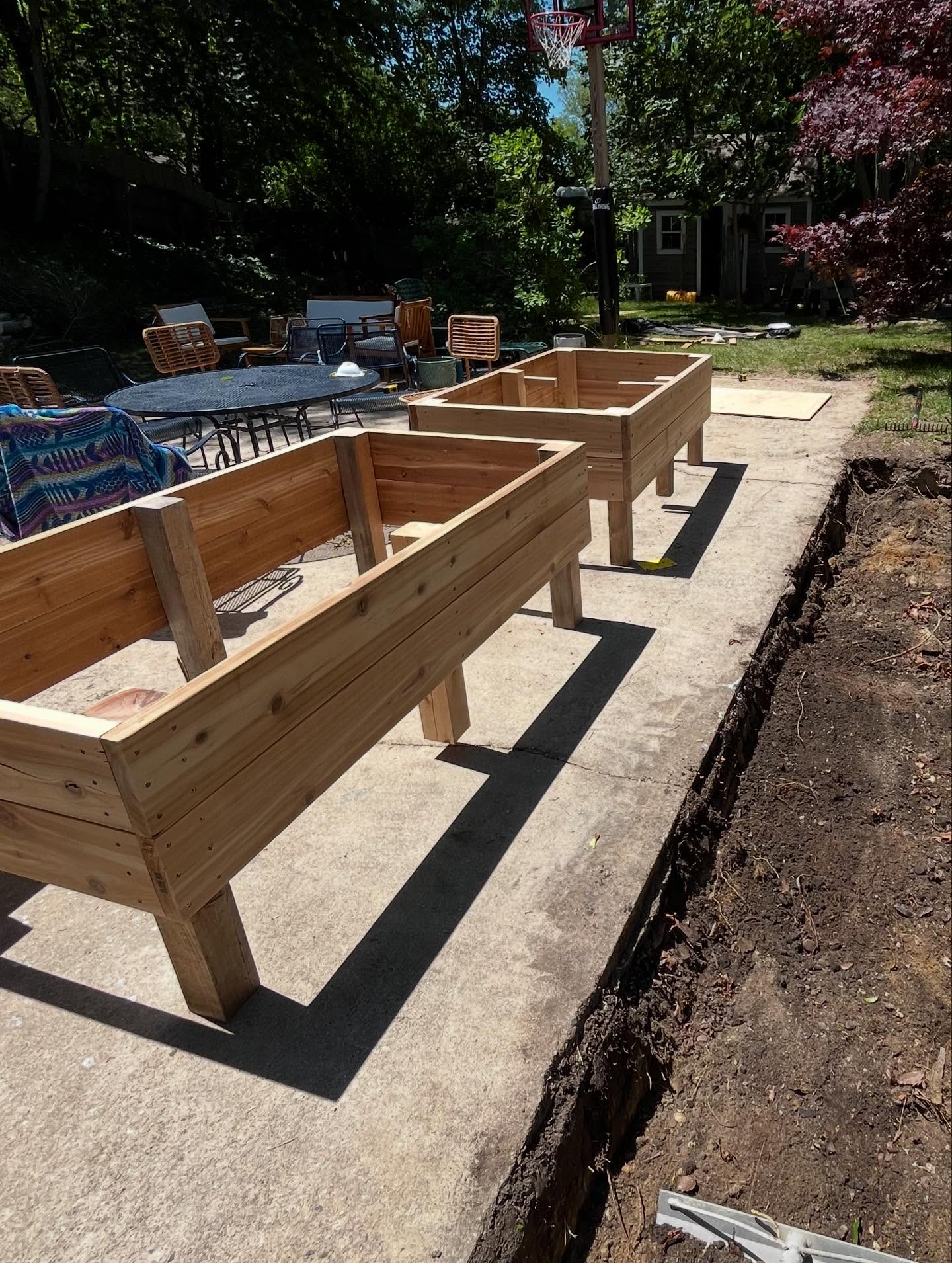 For this backyard garden project in Wellfleet, we installed two 6×3 raised beds directly onto an existing concrete patio. The beds sit flush against the edge of the slab—we carefully cut and removed sections of concrete to make room for proper placement and root depth.