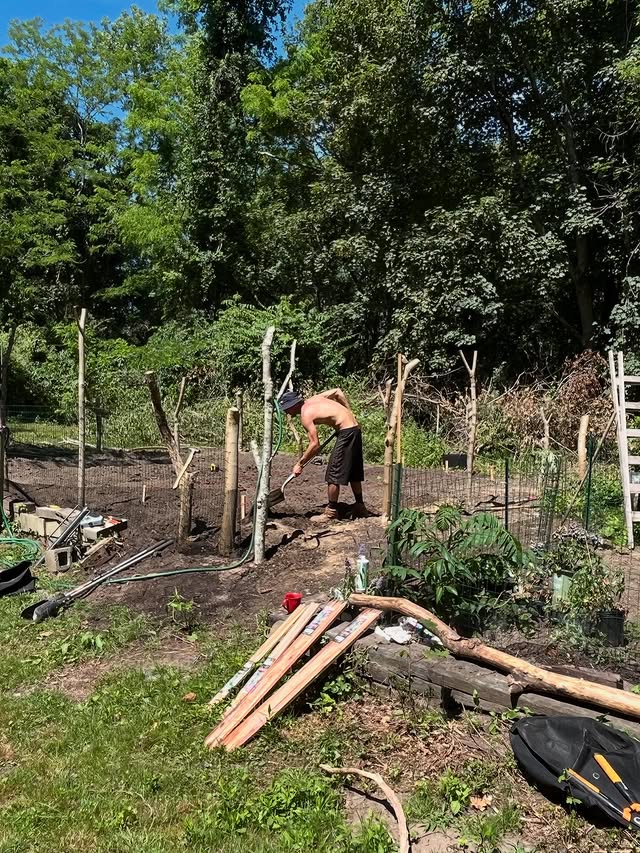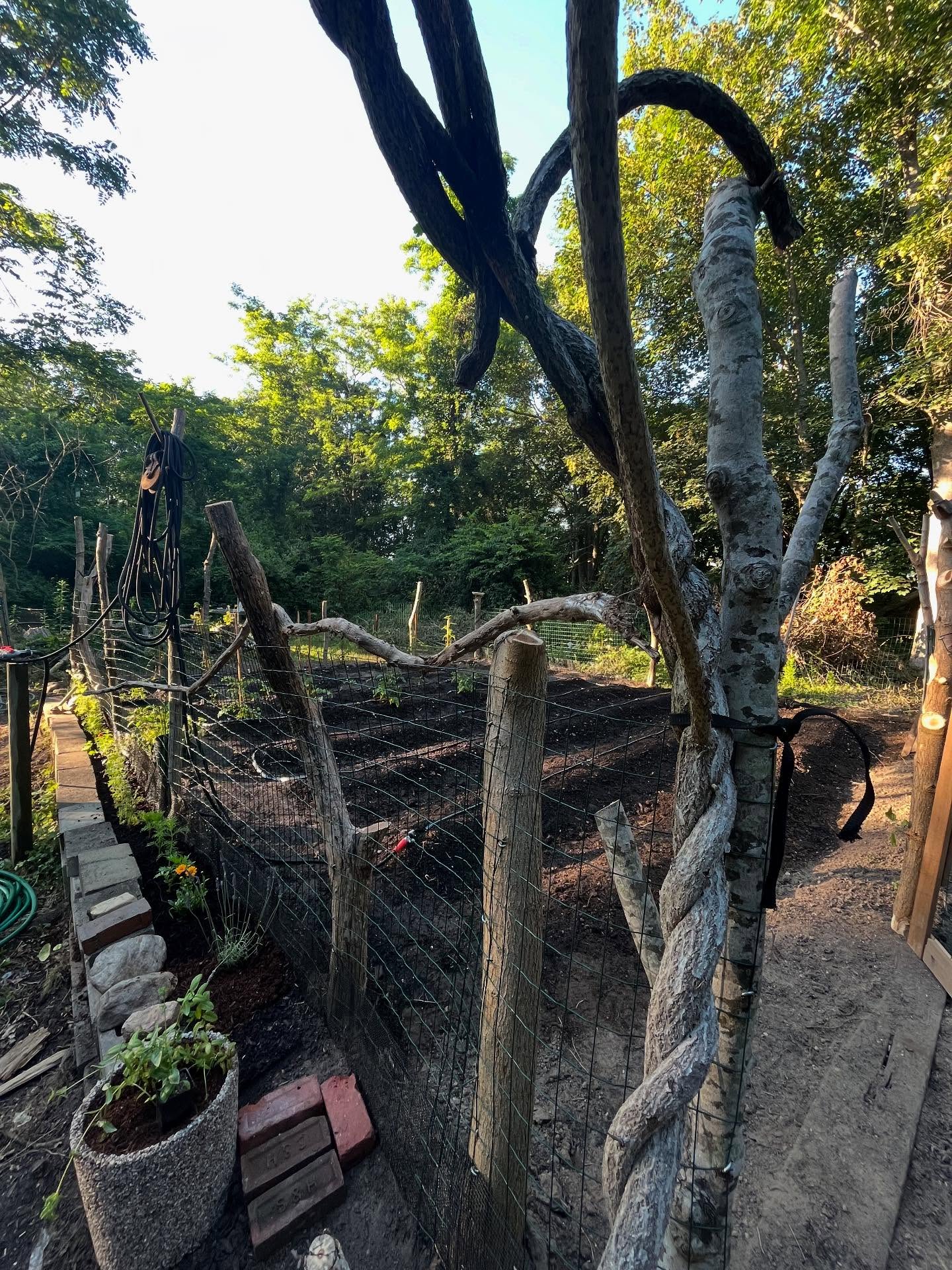 This Orleans property offered the perfect opportunity to blend utility with natural beauty. We began by harvesting black locust logs directly from the land—an incredibly rot-resistant wood known as “stonewood.” After shaving the bark to prevent future suckering, we used a string line to outline the garden perimeter and guide the placement of the irregular, naturally shaped posts.