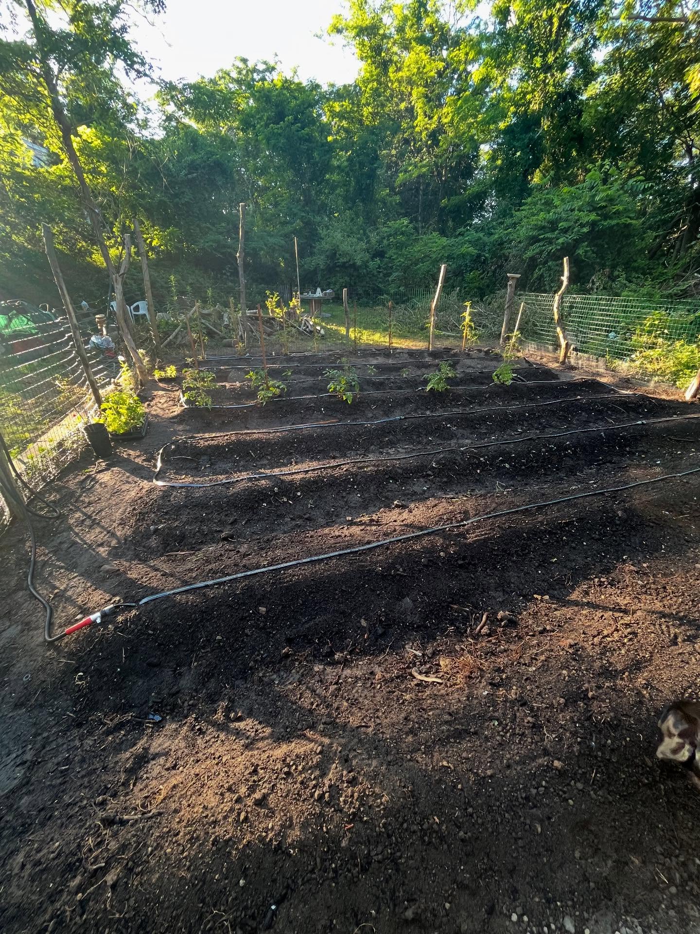 To finish it off, we shaped clean growing rows, laid drip line irrigation, and left the garden ready for planting — secure, functional, and full of rustic charm.